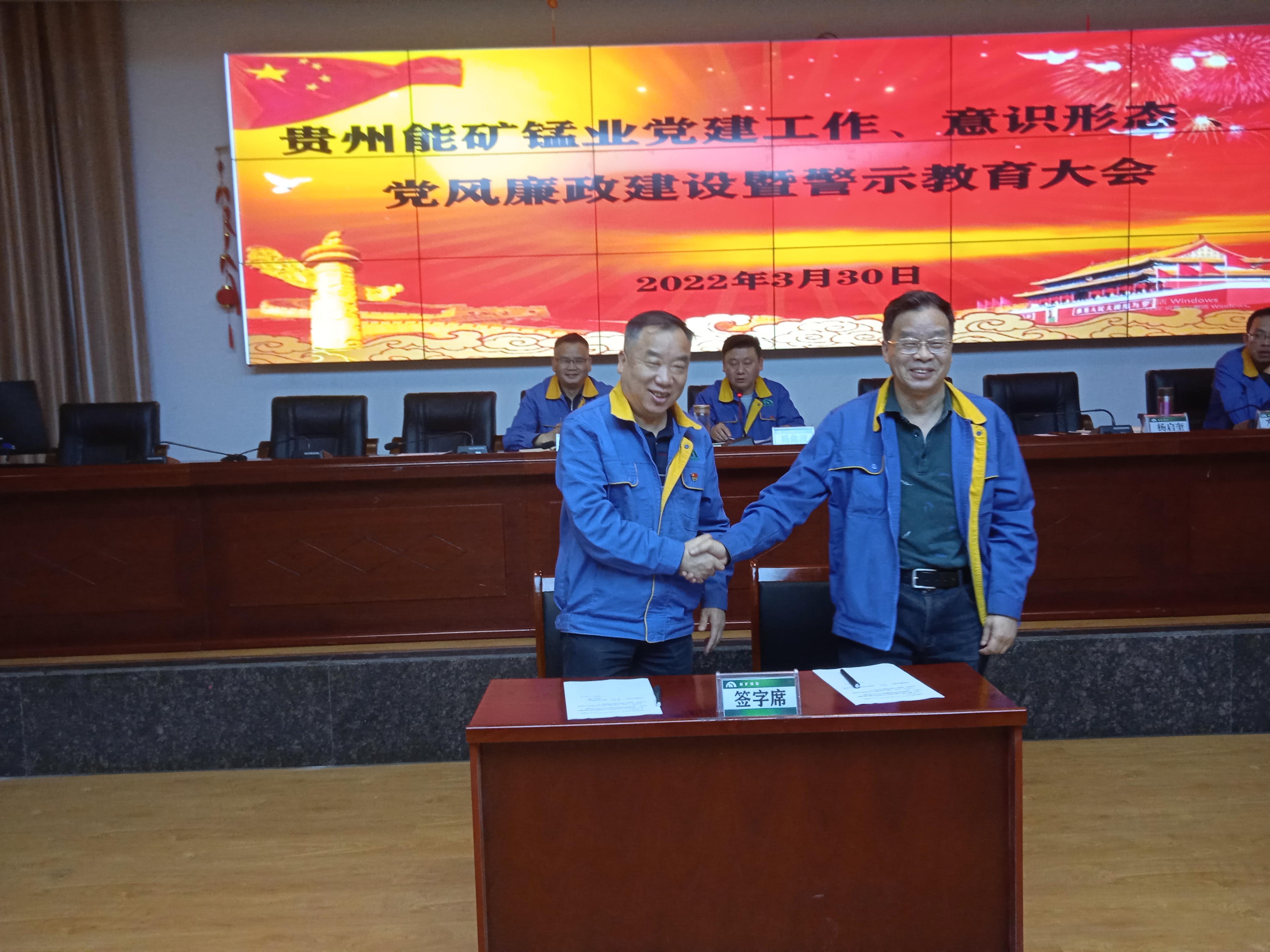 會前,楊曲波領(lǐng)學(xué)了習(xí)近平總書記在慶祝中國共產(chǎn)黨成立 100周年大會上的講話、十九屆六中全會、省第十二屆十次全會等精神,通報西南能礦集團(tuán)黨委2021年意識形態(tài)工作情況,部署能礦錳業(yè)2022年意識形態(tài)工作。公司黨委委員、紀(jì)委書記樊志領(lǐng)學(xué)十九屆中紀(jì)委六次全會精神,并作2021年度紀(jì)委工作報告。組織觀看警示教育紀(jì)錄片《零容忍》。會上,肖居廣與公司總經(jīng)理楊啟奎簽訂2022年履行黨風(fēng)廉政建設(shè)“一崗雙責(zé)”責(zé)任書,與新能源材料分廠、建強(qiáng)公司、經(jīng)營部簽訂《2022年黨風(fēng)廉政建設(shè)目標(biāo)管理責(zé)任書》。