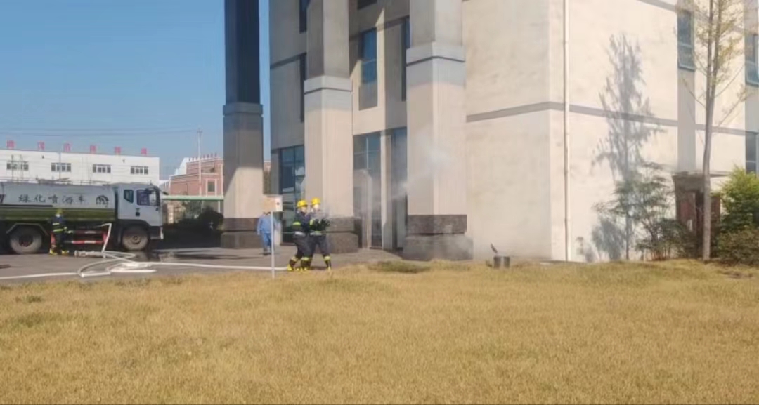 只見穿戴防毒面具的消防組人員拿著滅火器,對著熊熊燃燒的柴火進行施救,但因火勢較大未能撲滅,消防隊員于是打開消防水,不一會將大火澆滅。疏散引導(dǎo)組人員察看現(xiàn)場是否有人受傷,現(xiàn)場清點人數(shù),并立即向安全環(huán)保部負(fù)責(zé)人匯報人員情況,隨即演練圓滿結(jié)束。
