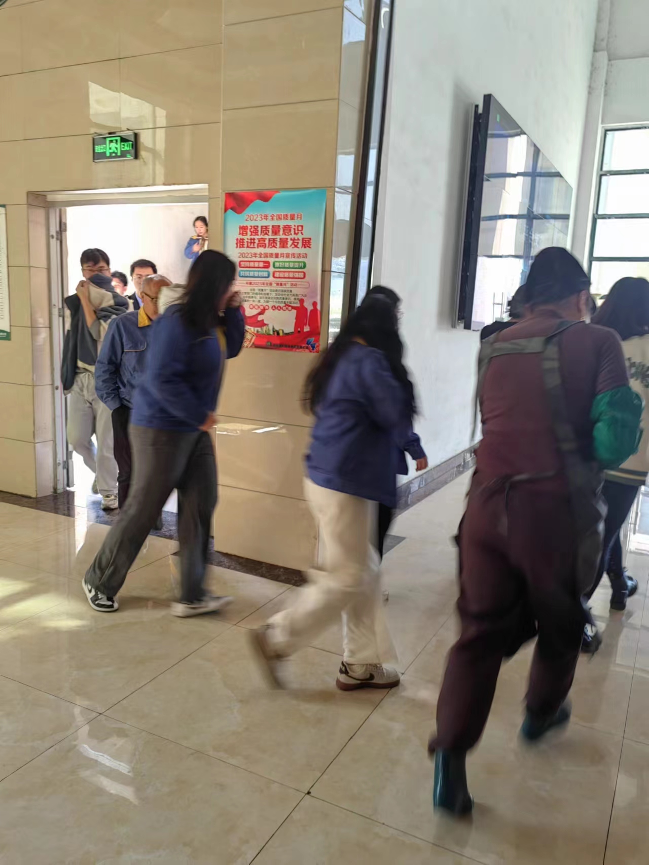 同時,演練人員在辦公樓5樓打開煙霧彈,煙感報警器響起,五樓辦公區(qū)員工紛紛跑出辦公室查看情況,看著濃烈的黑煙,演練人員告訴驚慌失措人員:請大家不要慌,用打濕的毛巾或衣袖堵住口鼻。把守在電梯口的演練人員指揮員工從消防通道撤離,其它樓層員工在演練人員的指揮下,有條不紊撤離火災(zāi)現(xiàn)場。