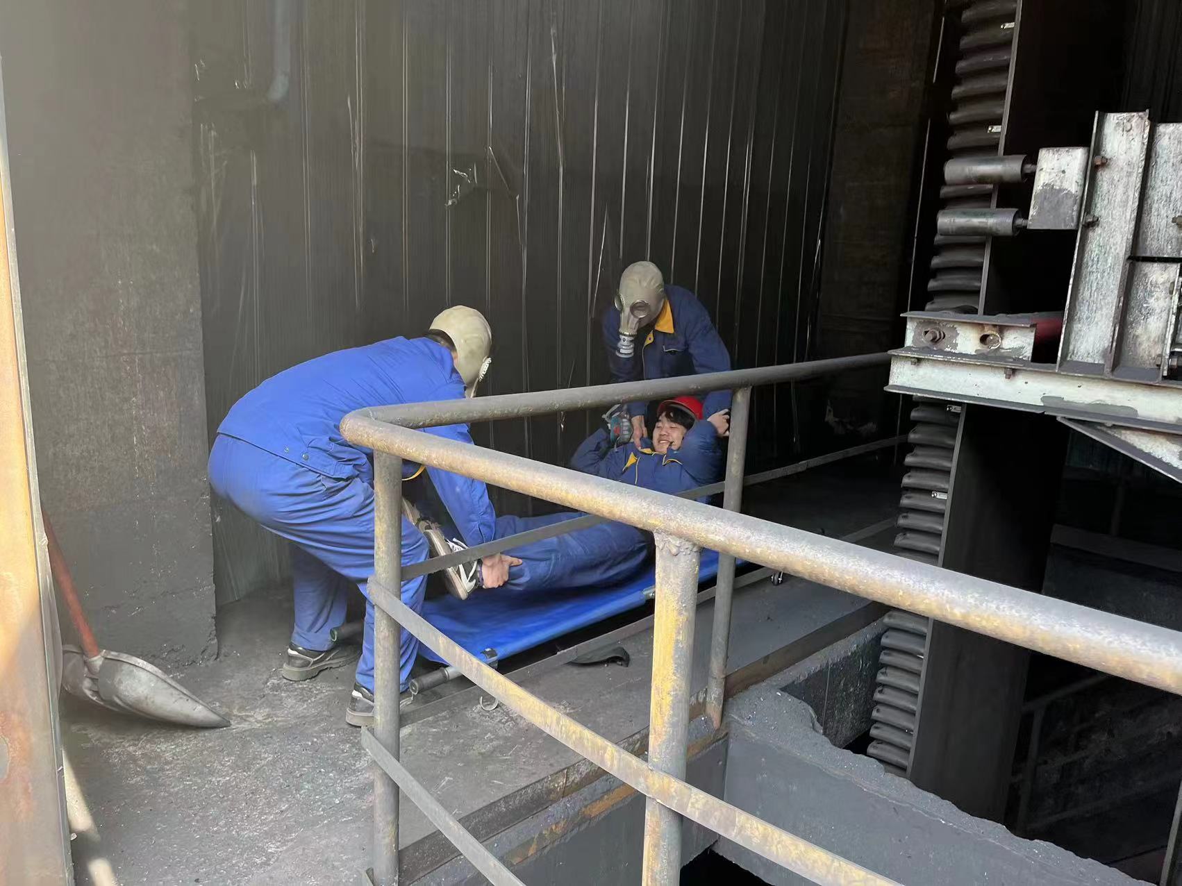 15:05,輸煤車間乙班員工何某在清理一號皮帶積煤時發生一氧化碳中毒倒地,另一員工郭某發現險情后,隨即立即通知當班值長,值長趙某接到事故報告后,立即啟動應急預案,向動力分廠、安全環保部負責人報告中毒險情,值長趙某在火速趕往事發點的同時撥打“120”急救電話,并聯系就近醫院施救。15:10,演練事故處理人員緊急戴上正壓式呼吸器,從事發點上風口處進入現場,火速將中毒員工抬至空氣清新處,等待醫療救護組人員施救。15:13,現場警戒組立即對事故現場進行隔離警戒,以防他人再次中毒。15:15,現場救護組對中毒人員何某進行施救,確保呼吸道通暢,中毒者呼吸微弱,醫護人員對其進行人工呼吸。15:30,中毒人員何某緩慢蘇醒。15:40,演練結束。